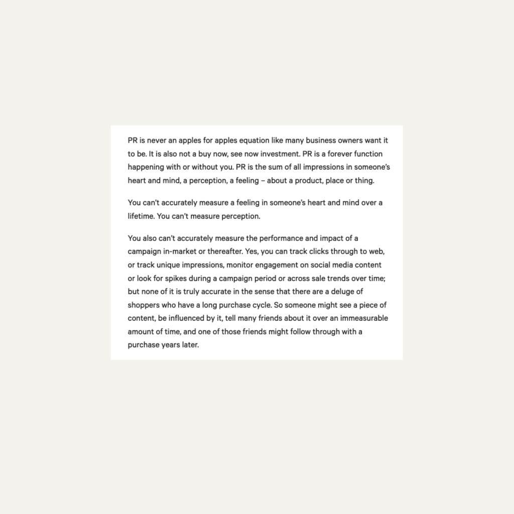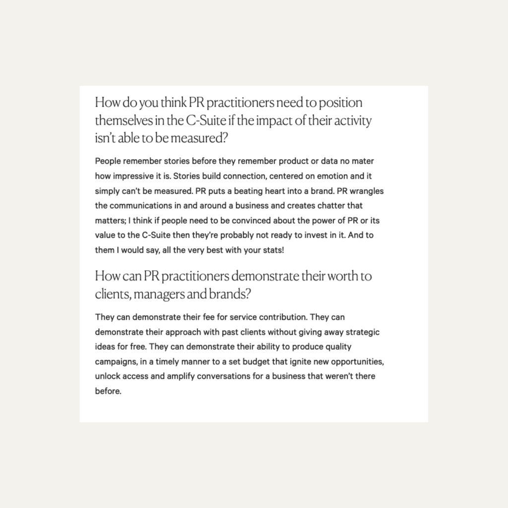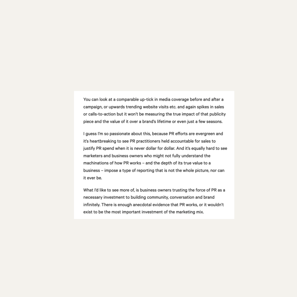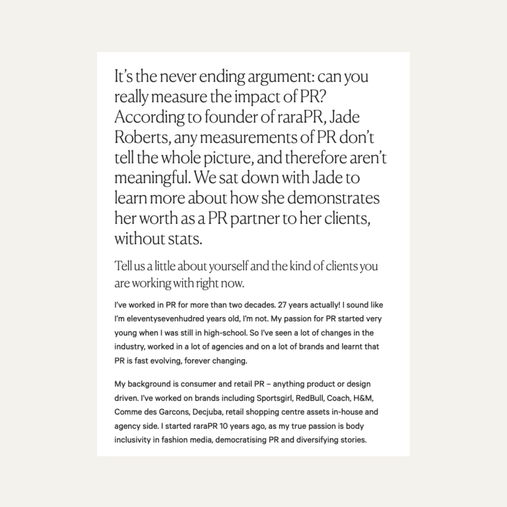 It’s the never ending argument: can you really measure the impact of PR? According to founder of raraPR, Jade Roberts, any measurements of PR don’t tell the whole picture, and therefore aren’t meaningful. We sat down with Jade to learn more about how she demonstrates her worth as a PR partner to her clients, without stats.