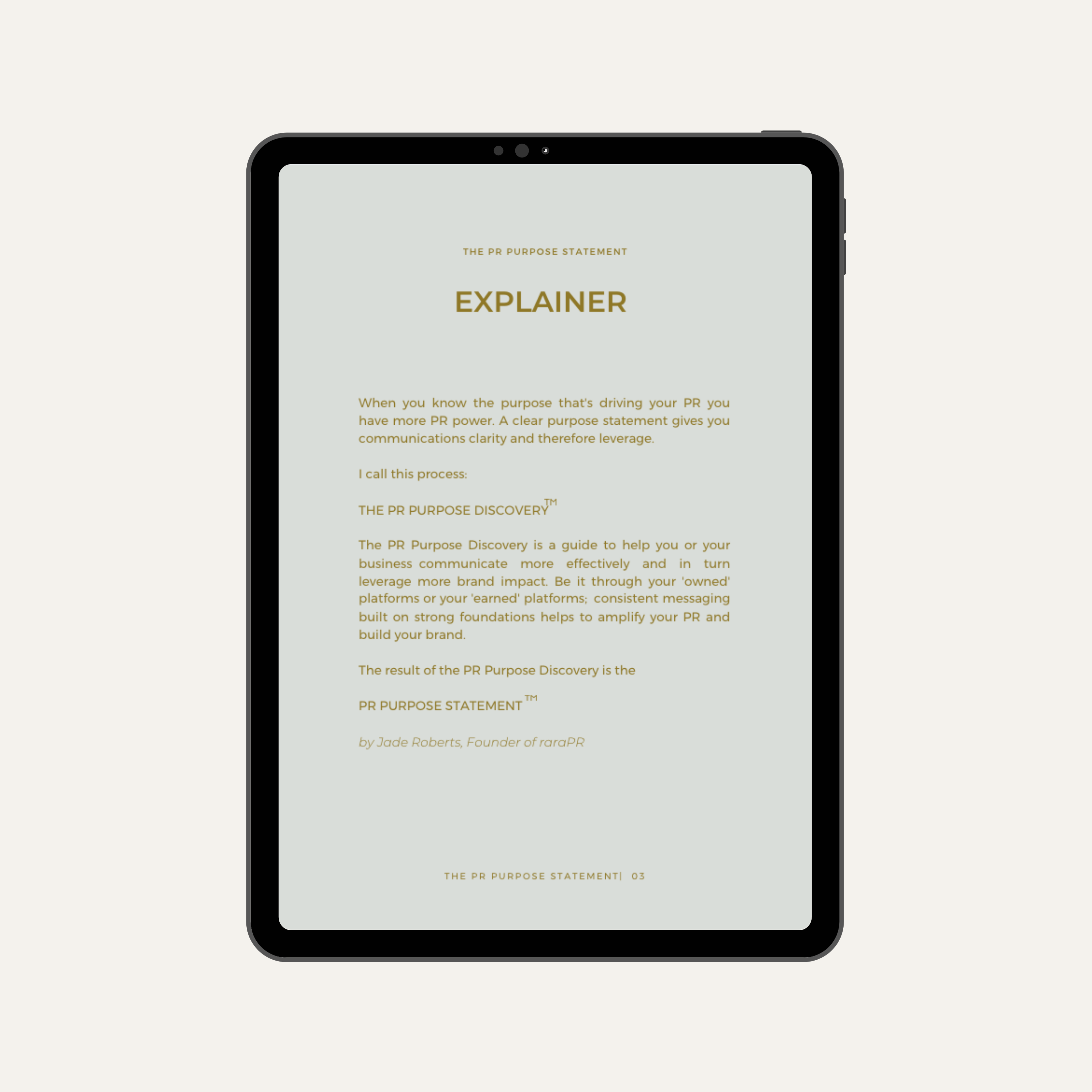 “The uniqueness in a business is where we find the unicorn dust; the stories that people care about. And the stories that can only belong to one single business alone. Over the many years (decades now) I’ve created a formula that helps businesses unlock their purpose statement. It’s not just a brand statement; there are elements to this that make it uniquely a PR Purpose Statement. It’s your story and it’s yours to take hold of, own and share so that when decisions about you and your business are made in a room you’re not in, you’ve had influence and impact on the outcome. This is a product, a strategy, a template that helps you unearth your PR Purpose Statement.” – Jade Roberts, raraPR founder.