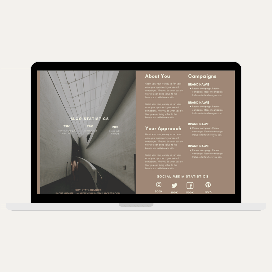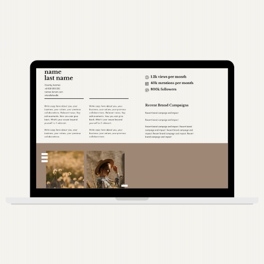 An easy to follow interactive digital PR template. This is 99 pages of professionally designed media kit options for content creators looking to PR their personal brand and align with brands or to pursue media coverage. Each media kit page has been designed with decades of industry experience with regard on where to place what to generate media and brand cut-through. There are industry expectations and style requirements a media kit needs to have, each variation of each page layout does all the PR thinking for you. Up-level your PR tools and systemise your approach. This is a product designed to save you from graphic design or Google misadventures on where to place what where.